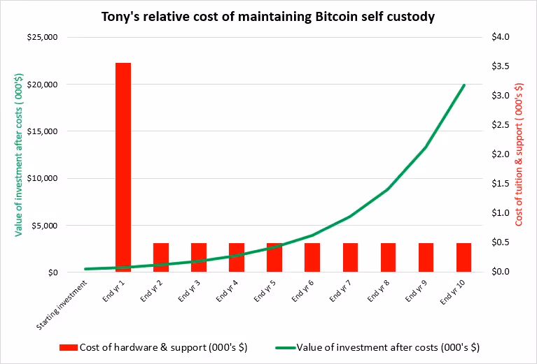 This means that Tony spent $3,358 in getting his self-custody set up in year 1 and will invest a further $500 per year on remote support from technical experts to ensure his setup and skills always remain up to date.