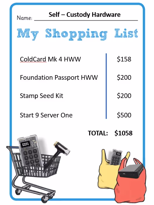 The reality is that if you want to take self-custody in such a way that we can be sure you will keep your Bitcoin secure long term, then there will be some necessary costs to incur. These come in the form of buying certain pieces of hardware and in our example, our character Tony also invests in some additional expert tuition to ensure he gets things right.