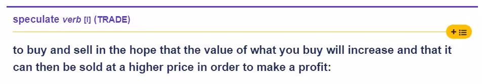 “To buy and sell in the hope that the value of what you buy will increase and that it can be sold at a higher price in order to make a profit.”