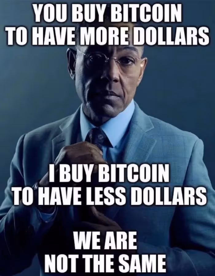 If your answer is “Dollars” then this signals that you consider fiat currency to be ‘money’, and Bitcoin to be the speculative bet that allows you to profit by selling it for more $ in the future. This requires you to use dollars as your denominator and your underlying measure of profitability.