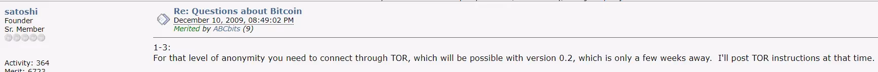 We also know that Satoshi saw value in Bitcoin users being able to maintain their privacy instead of having their entire financial lives tracked and monitored. Before his disappearance he spent time discussing Bitcoin on public forums with other users. Here in 2009, we see him discussing the best methods to ensure anonymity when using Bitcoin and actively developing Bitcoinâs software to be compatible with privacy tools.