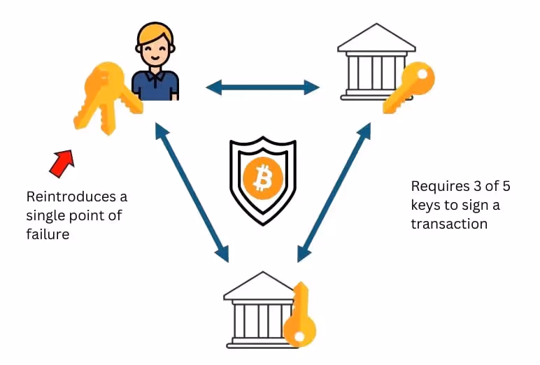 For example, if you go for a setup where you hold the majority of the keys, then you’ve removed a single point of failure when itcomes to potentially losing them. But you still have a single point of failure when it comes to having the keys you’re controlling stolen and used to move your funds.