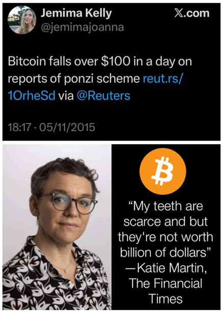 This isn’t the first time the FT has declared Bitcoin worthless. Jemima has been trying to dunk on Bitcoin since 2015 when it was priced at just $300, while her colleague Katie Martin spent last year trying to work out why it’s worth more than her teeth.