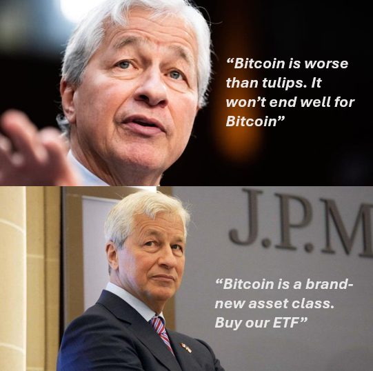 Had you listened to this duplicitous banker you would have avoided Bitcoin while JP Morgan was quietly positioning itself to profit from it. The bank is now an authorized participant for BlackRock's Spot Bitcoin ETF. Did he suddenly realize Bitcoin is valuable? Or was he purposefully misleading you all along?