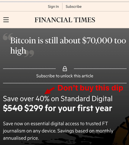 The hacks at the Financial Times don’t understand Bitcoin, and any readers unfortunate enough to have been influenced by their consistently poor reporting over the years have missed out on increasing their wealth by over 23,000%. Which helps to explain why they have to offer deep discounts to potential new subscribers.