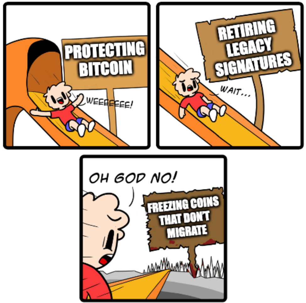 This proposal is no different. The quantum bogeyman makes for a convenient story, doesn’t it? “We’re just protecting Bitcoin”, they say, while quietly preparing to retire perfectly acceptable legacy signatures and freeze any coins that don’t keep up with the new rulebook.