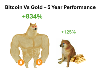 Over the past 5 years, Gold has only increased by a paltry 125%, meanwhile, in the same timeframe, Bitcoin is up a mighty 834%+!