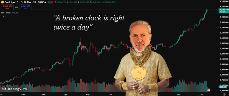 It’s nice to see Peter able to celebrate for once, but it’s yet to be seen if he will actually get to finish said victory lap. Because while Gold has outperformed Bitcoin for the past 10 months, when you zoom out even a little bit, Bitcoin’s performance has absolutely dwarfed Gold.