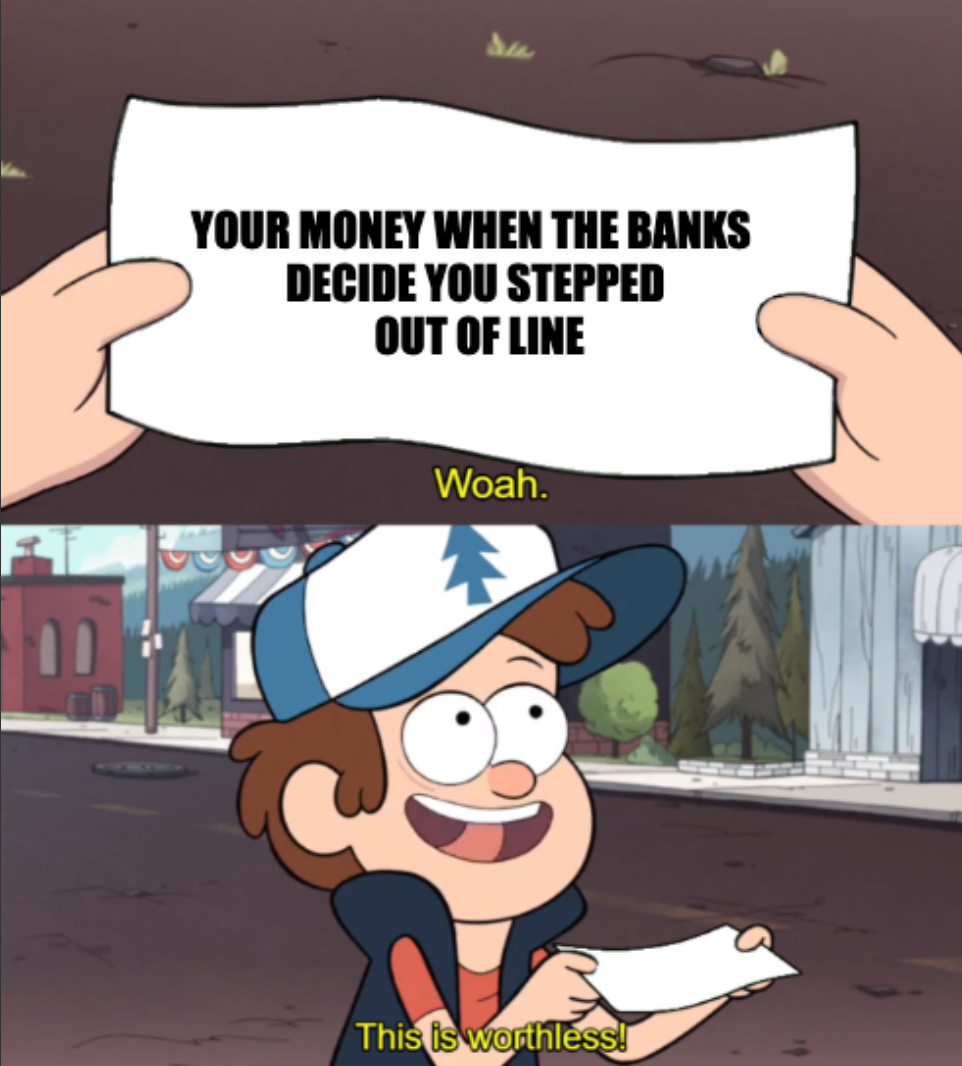 What would you do if your access to money could be switched off, not because you broke the law, but because you made the wrong political decision?